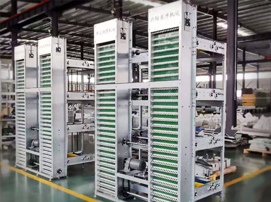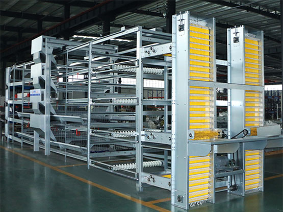 The belt+integral egg claw mechanism has strong egg collecting capacity, simple structure, stable and reliable operation of belt tensioning and deviation correction device, less broken eggs. The horizontal egg collecting device adjusts the direction of eggs during rolling. There is a collecting tray on each layer. The guiding device for collecting soft shell eggs and dirt eggs ensures that eggs are evenly distributed on the elevator egg collecting device, improving efficiency